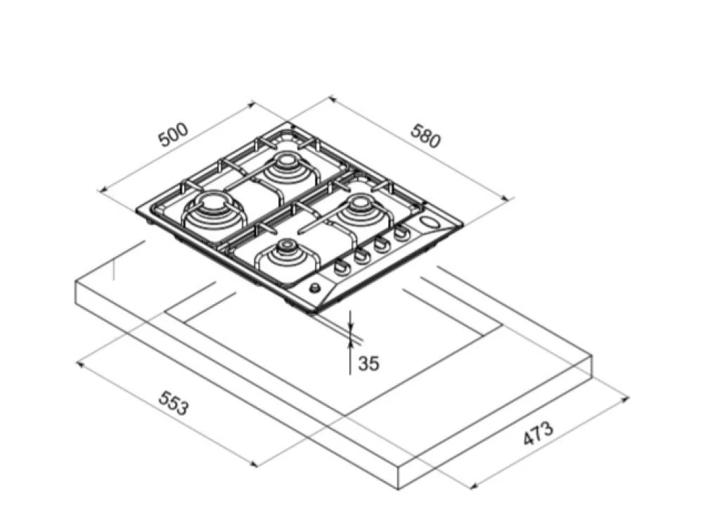 موقد غاز 60 سم 4 شعلة – شبك ثقیل اشعال ذاتي كھربائي – صمام أمان – مفاتیح جانبیة 220-240 فولت – 60-50 ھرتز – 0.6 واط صنع في ایطالیا