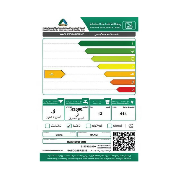 خصائص فنية عن غسالة ملابس حوضين هام 12 كيلو – أبيض :